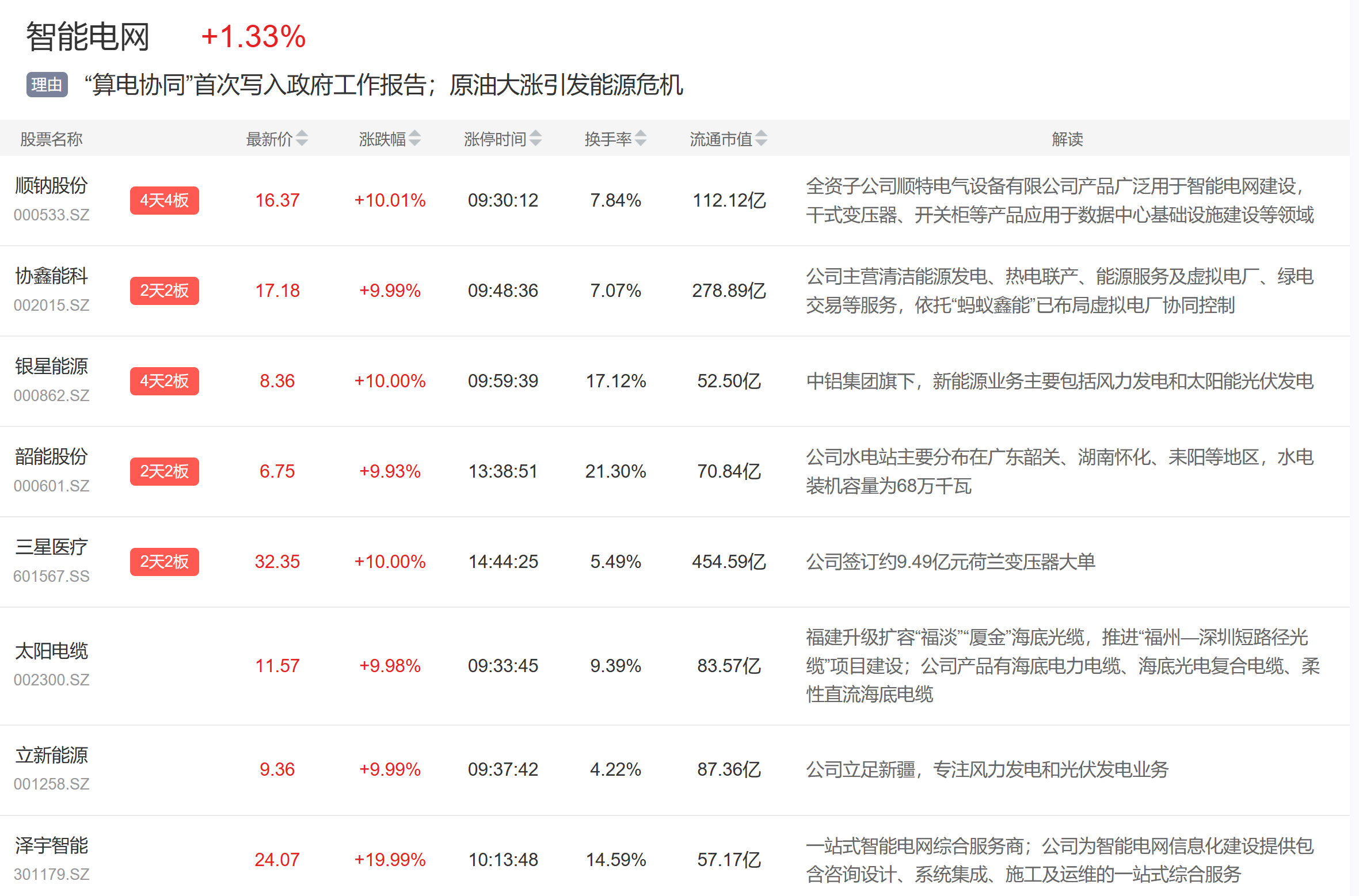 智能电网概念今日继续活跃,顺纳股份4连板,协鑫能科、韶能股份等2连板,太阳电缆、泽宇智能等涨停。