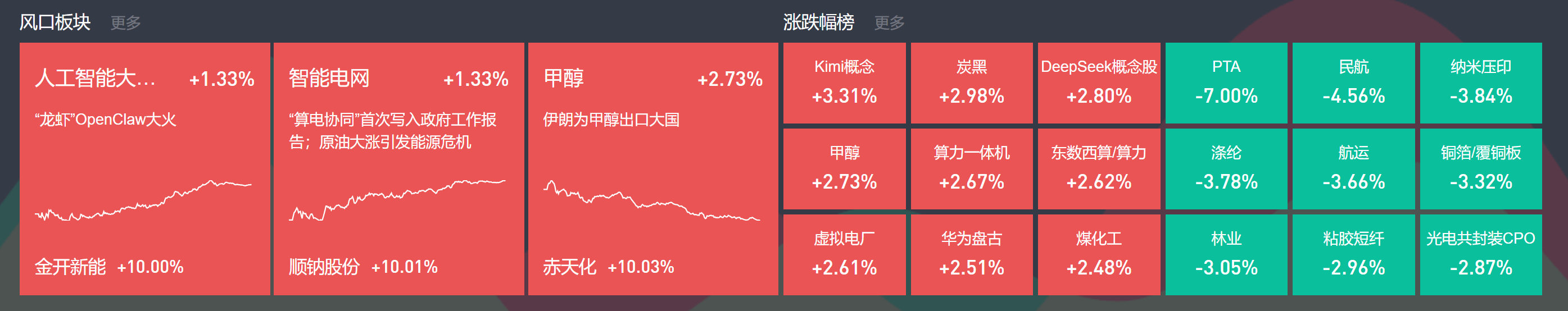 除上述热点外,油服、天然气、甲醇等高开低走;机器人、芯片局部活跃;跌幅方面,航运跌幅居前。
