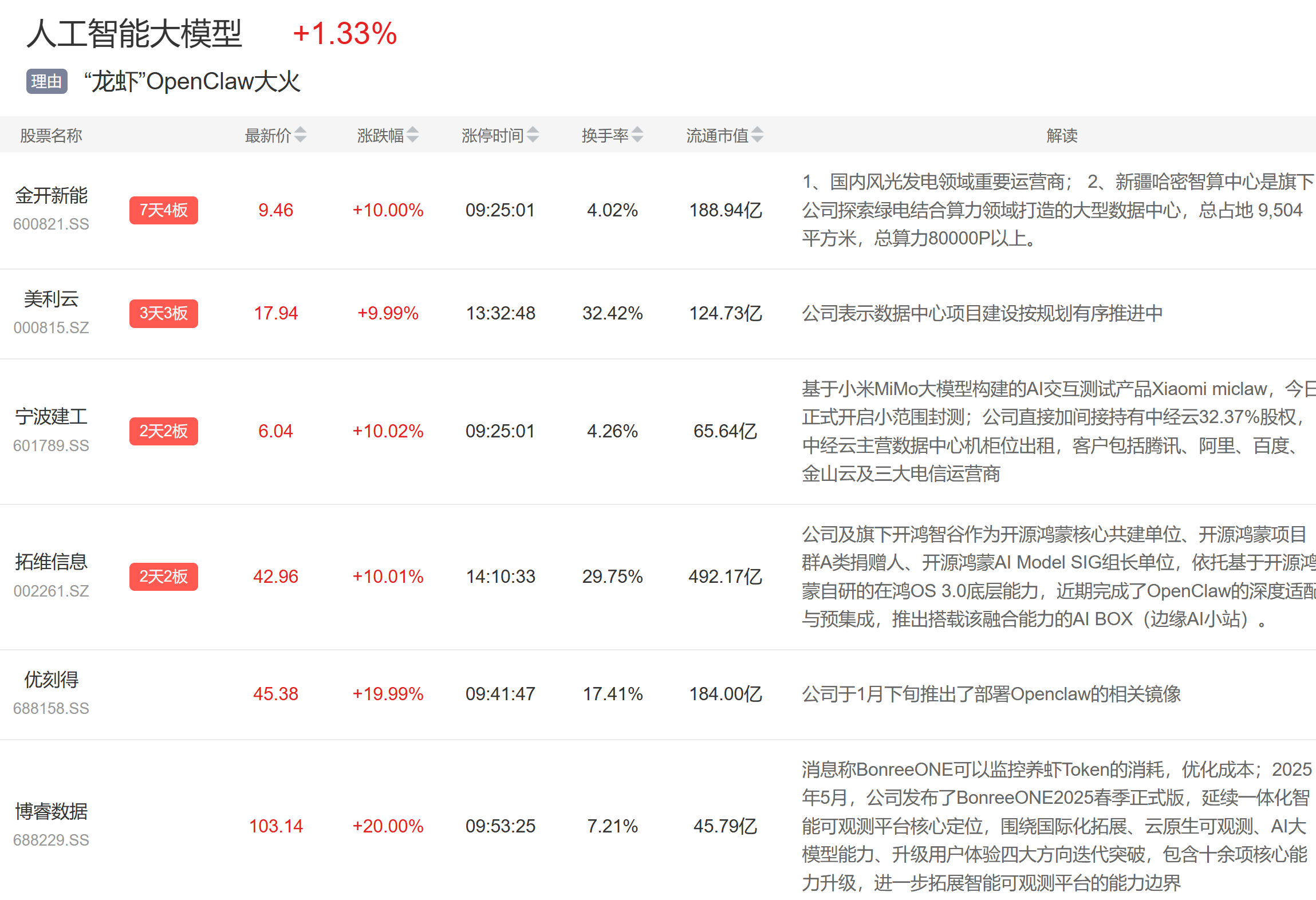 人工智能大模型概念今日大涨,美丽云3连板,宁波建工、拓维信息2连板,优刻得、博睿数据等涨停。