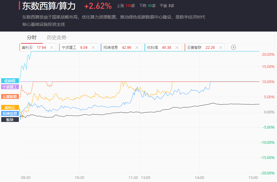 优刻得(20CM)、云赛智联、泽宇智能(20CM)、群兴玩具、鸿博股份、青云科技(20CM)、智微智能、顺网科技(20CM)、宏景科技(20CM)先后涨停;
