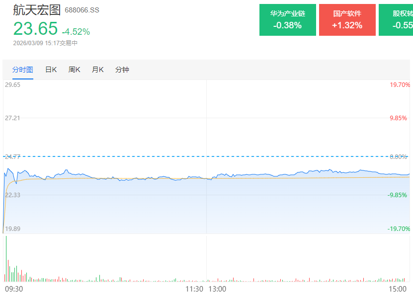 开盘后,航天宏图快速反弹并开启震荡全天,最终收跌4.52%。
