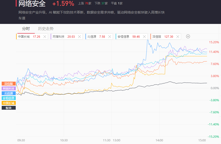 网络安全板块同样低开高走,最终收涨1.59%。