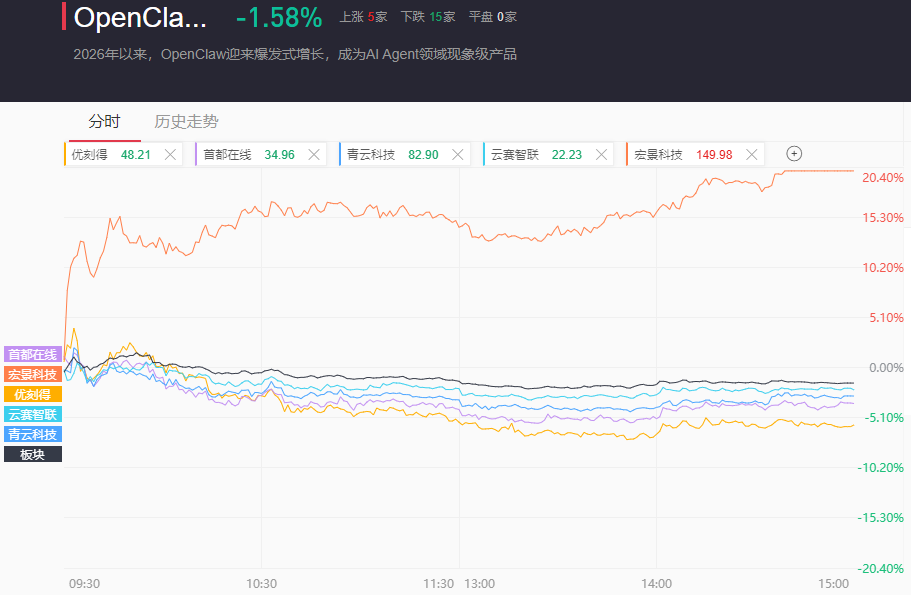 Openclaw概念全天小幅冲高回落,最终收跌1.58%。