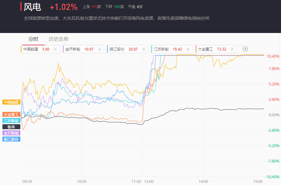 中国能建(2板)、金开新能、振江股份、江苏新能、大金重工、建投能源、中际联合、双一科技(20CM)、德力佳(20CM)等先后涨停;