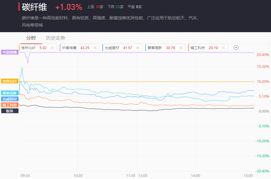 在中复神鹰的带动下,吉林化纤、吉林碳谷、光威复材等昨日均有冲高跟涨表现。