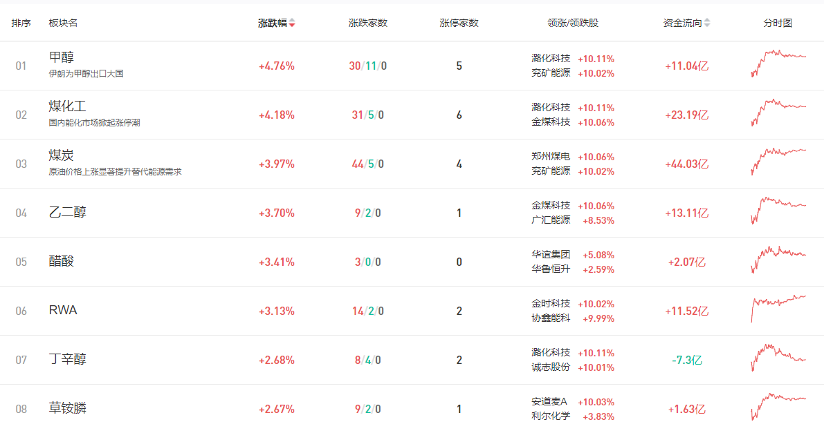 截至收盘,甲醇、煤化工、乙二醇、醋酸等板块涨幅均位居市场前排。