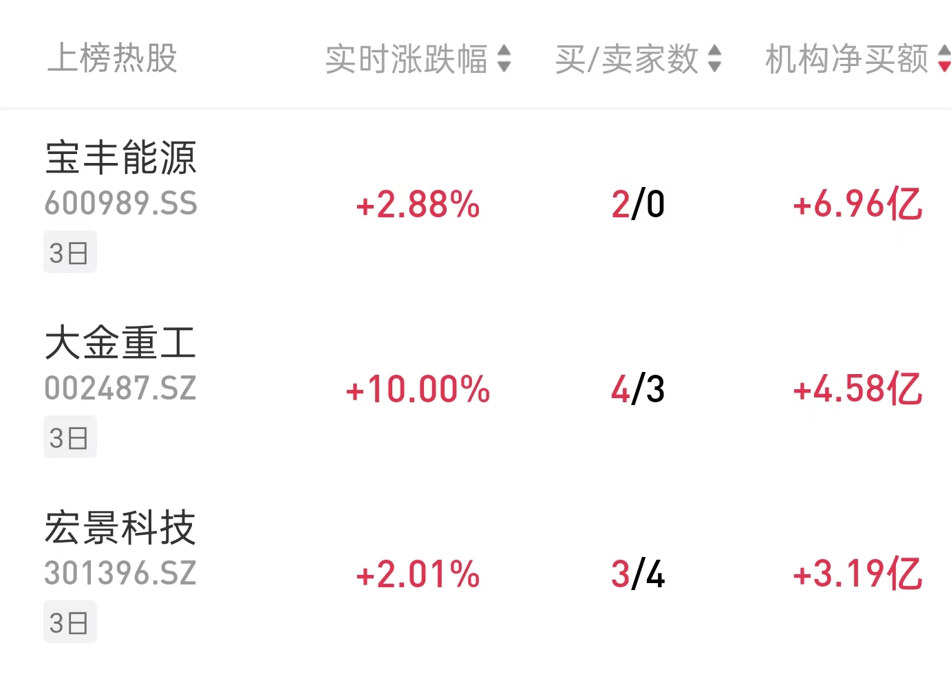 今天机构龙虎榜上榜30只个股,净买入17只,净卖出13只。当日机构买入最多的个股前三位是:宝丰能源(6.96亿)、大金重工(4.58亿)、宏景科技(3.19亿)。