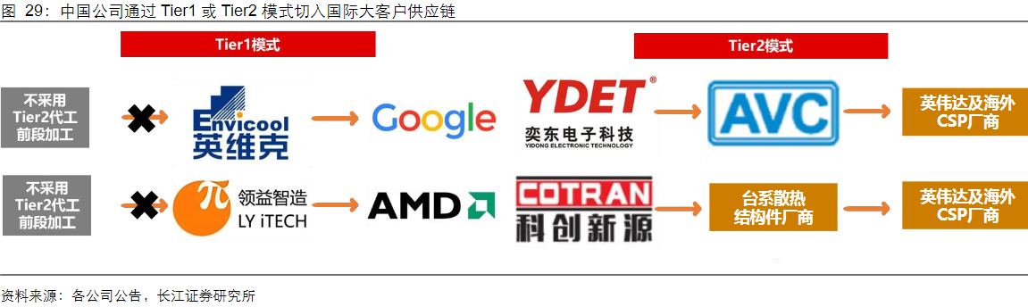 液冷交付模式分为Tier1直销与Tier2代工两类:Tier1厂商以液冷板或全系统模组形式向下游供货,壁垒高、溢价强,适合具备系统集成能力的头部厂商。