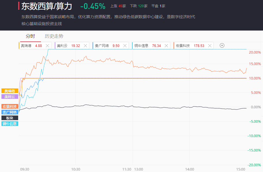 算力板块竞价低开1.5%,开盘大幅反弹一度涨至0.8%,此后震荡回落收跌0.45%。