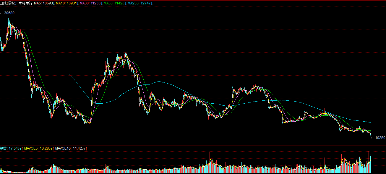 而生猪期货在2021年1月上市,上市时挂牌价格是30680元/吨,该价格上市即巅峰,堪比中石油。