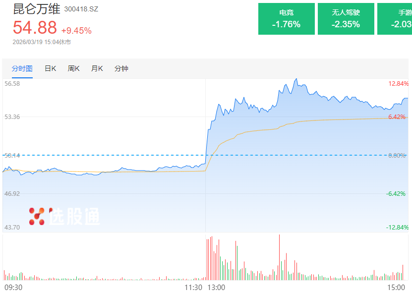 昆仑万维盘中一度逆势涨超13%,最终收涨9.45%,煞是风光。