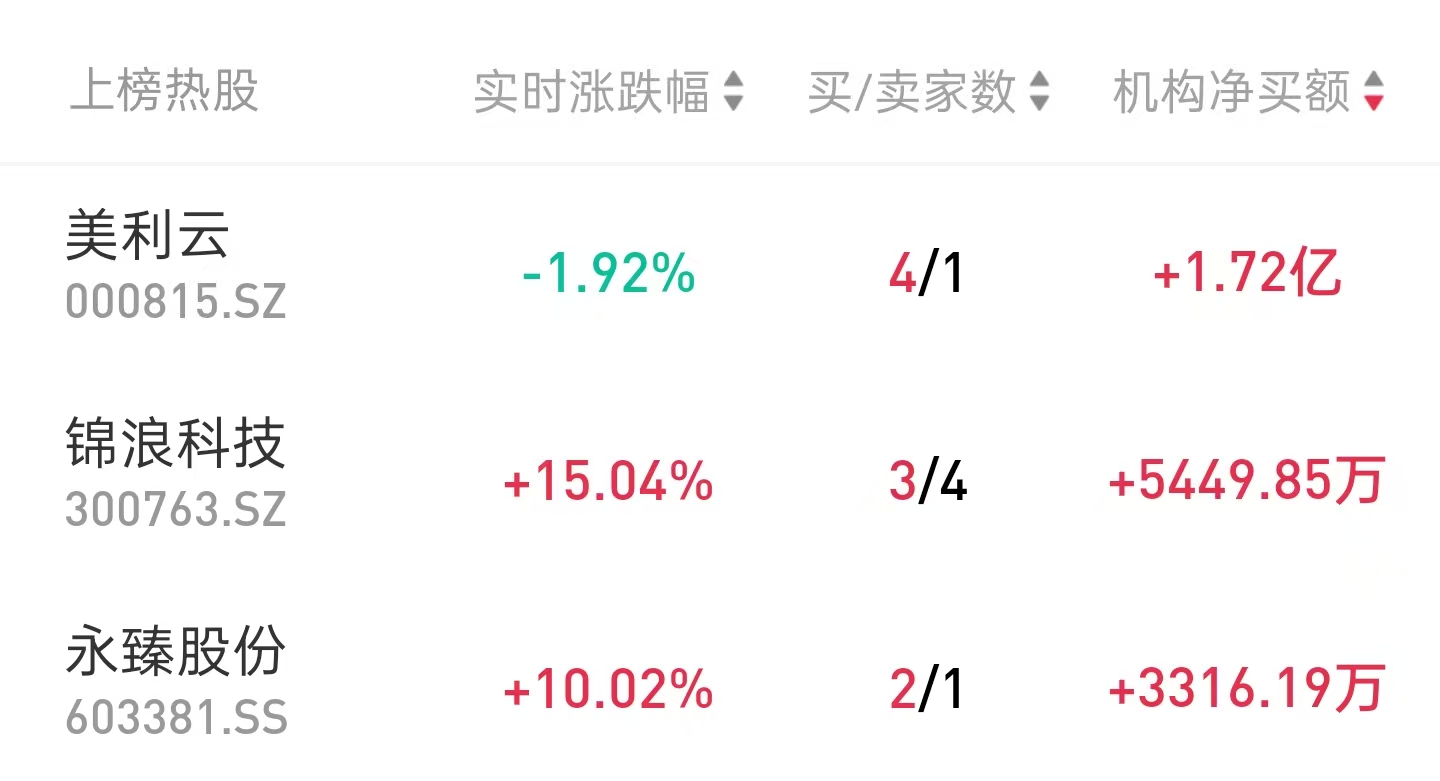 今天机构龙虎榜上榜31只个股,净买入14只,净卖出17只。当日机构买入最多的个股前三位是:美丽云(1.72亿)、锦浪科技(5449万)、永臻股份(3316万)。