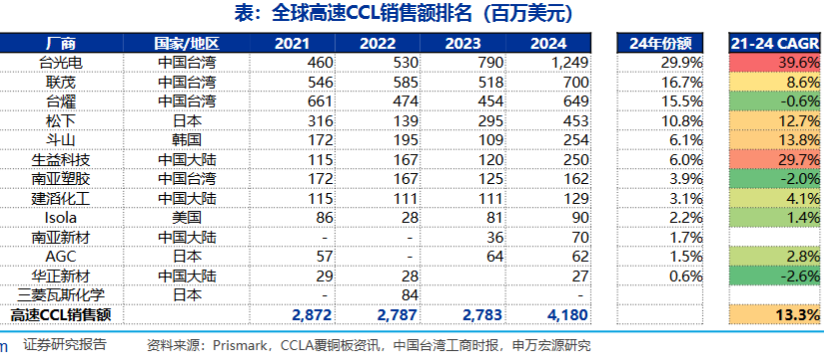 目前,台资、日韩企业主导高速CCL供应。