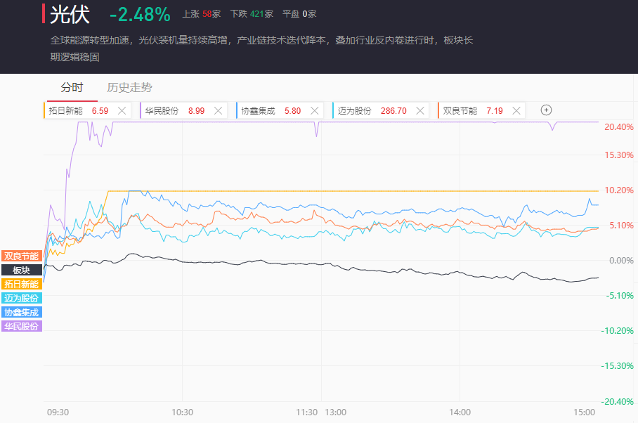 光伏板块低开高走一度翻红,虽然最终收跌2.48%,但也远优于整体市场表现。