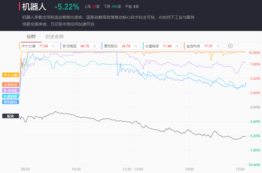 机器人板块早盘整体在水下一点点盘整,但此后跟随市场单边下跌,最终收跌5.22%。