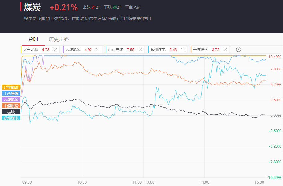 煤炭板块早盘一度涨超2.7%,此后单边回落收涨0.21%,成为两市罕见收涨的板块。