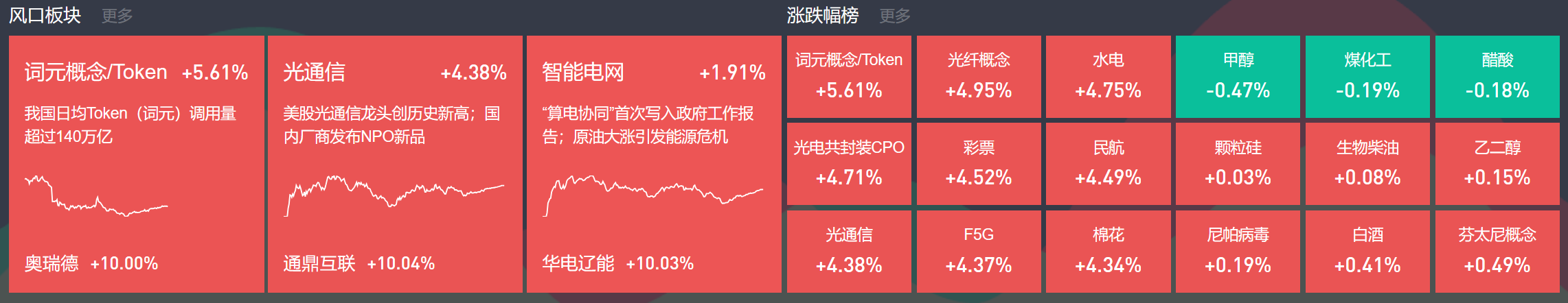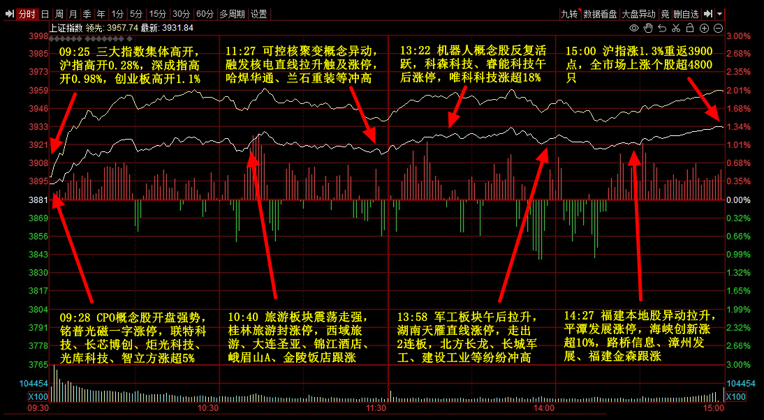 市场全天高开高走,沪指重返3900点上方;绿电概念股持续爆发,华电辽能8连板,晋控电力、粤电力A、湖南发展等十余股涨停;光通信概念内部轮涨,铭普光磁一字板,通鼎互联、长飞光纤等涨停;算力概念股活跃,大位科技、利通电子、真视通等涨停;午后军工板块走强,湖南天雁、长城军工涨停;福建自贸区板块尾盘拉升;下跌方面,油气股调整,科力股份、通源石油跌超6%。个股呈现普涨态势,沪深京三市超4800股飘红,今日成交超2.19万亿。