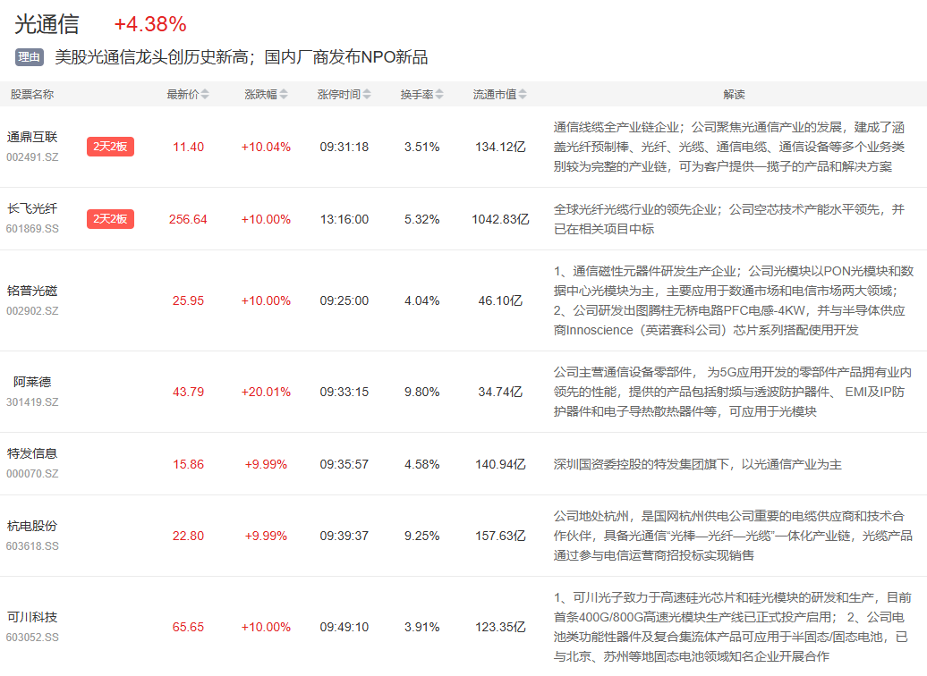 光通信板块内部轮动,铭普光磁一字板,长光华芯早盘一度冲板20cm,长飞光纤、特发信息双双上板。