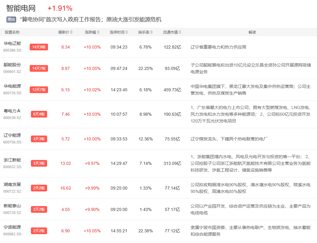 智能电网板块今日强者恒强,尾盘出现一点分歧;龙头华电辽能实现8连板,辽宁能源、浙江新能3连板,韶能股份、宁波能源、粤电力A等多股实现2连板。