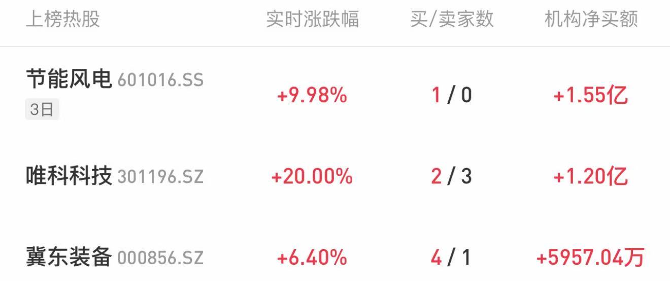 今天机构龙虎榜上榜28只个股,净买入10只,净卖出18只。当日机构买入最多的个股前三位是:节能风电(3日1.55亿)、唯科科技(1.2亿)、冀东装备(5957万)。