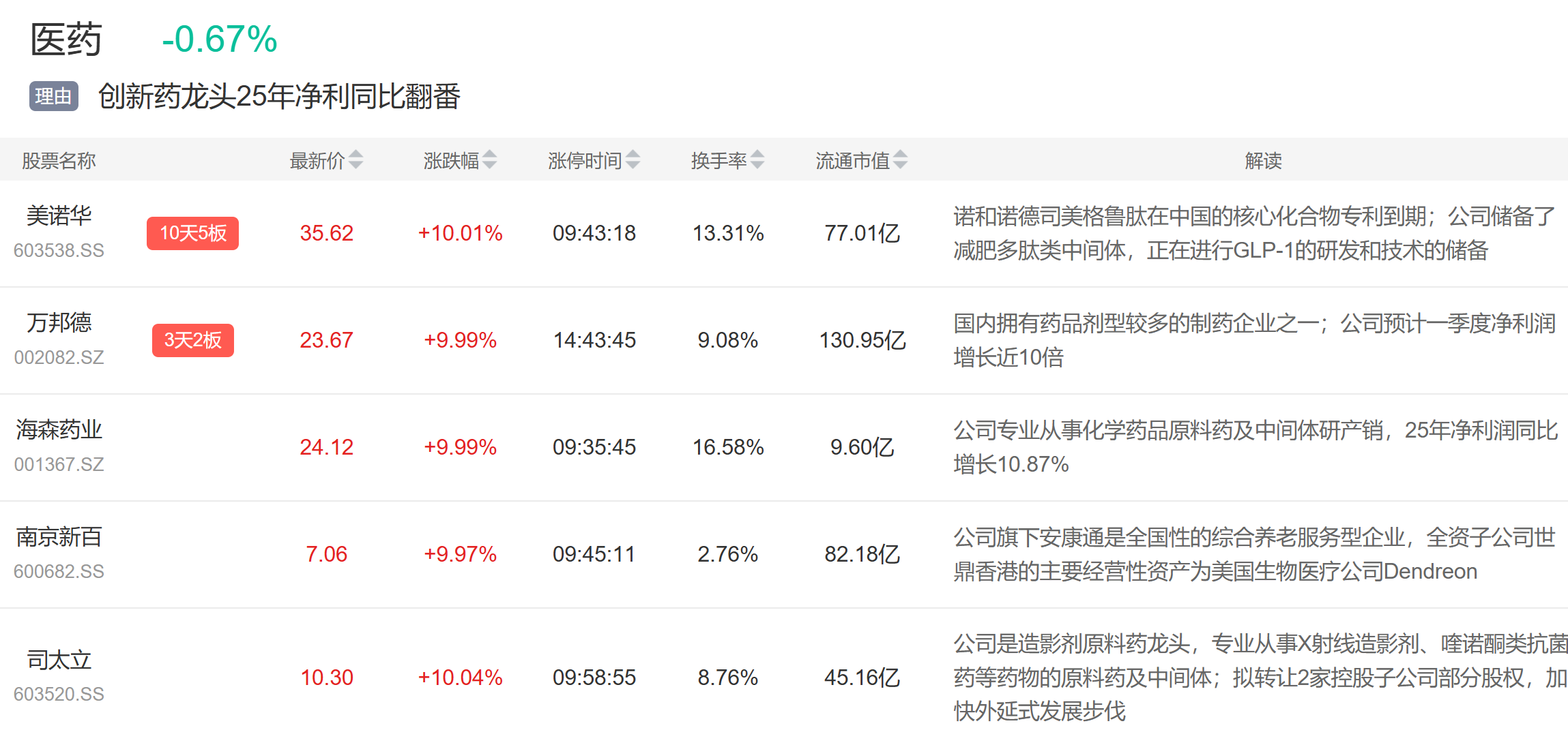 医药板块今日再度活跃,美诺华3连板、万邦德、海森药业等涨停。
