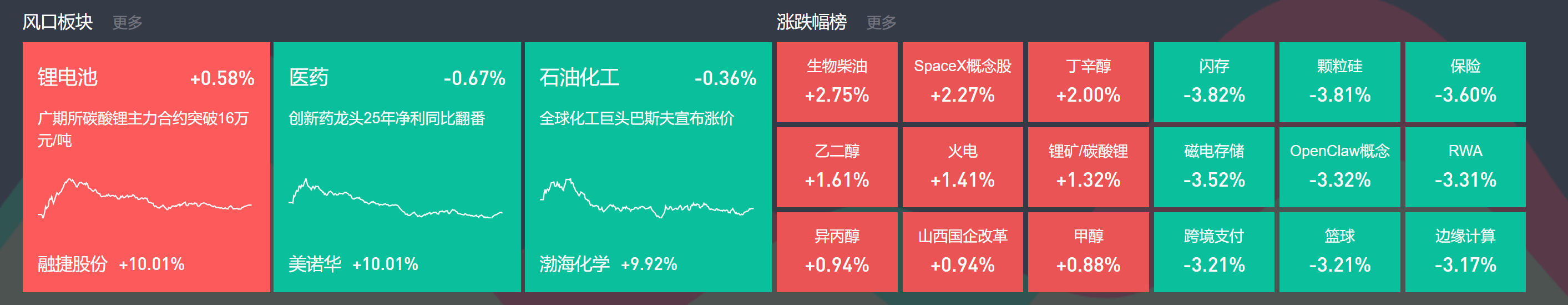 除上述热点外,石油化工、智能电网等表现相对活跃;跌幅方面,风电、算力等跌幅居前。
