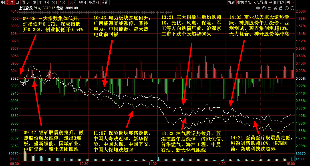 沪指全天缩量调整,创业板指冲高回落。锂电池板块逆势走强,融捷股份3连板,丽岛新材、大东南、石大胜华等涨停。电力股反复活跃,华电辽能9连板,广西能源、华电能源、晋控电力等近10股涨停。商业航天概念局部拉升,神剑股份、中超控股、西部材料、再升科技涨停。下跌方面,光伏板块调整,国晟科技跌停;算力租赁概念走低,电光科技跌停。个股跌多涨少,沪深京三市约4500股飘绿,今日成交1.96万亿。