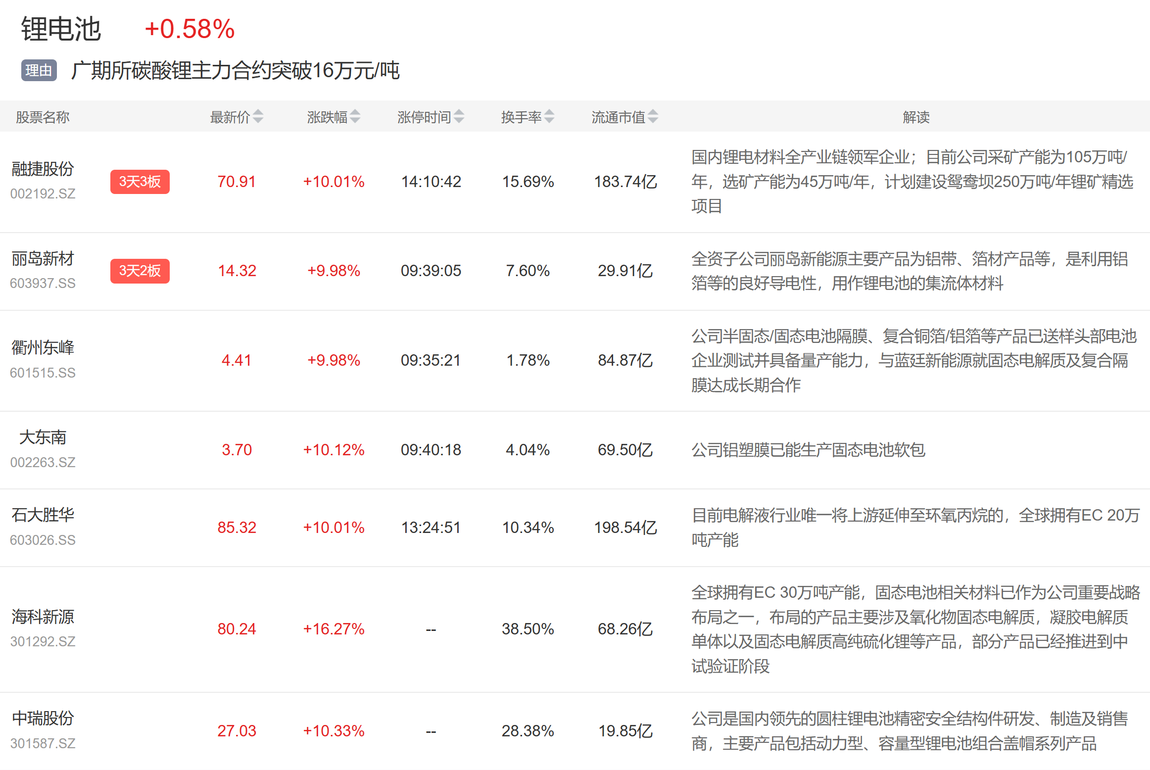锂电池概念今日大涨,融捷股份3连板,丽岛新材、大东南、石大胜华等多股涨停。