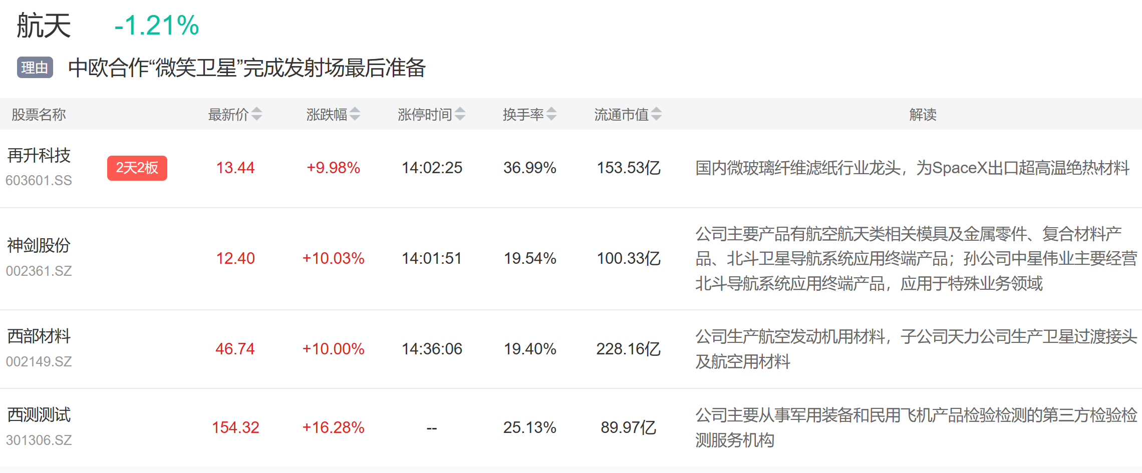 航天板块今日较为活跃,再升科技2连板,神剑股份、西部材料等涨停。