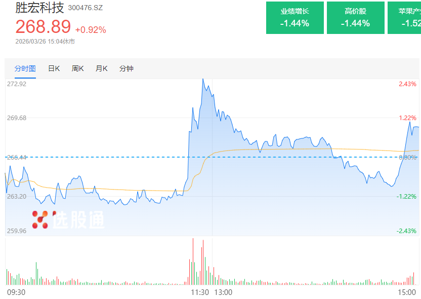 胜宏科技盘中一度涨近2.5%,午后单边回落但尾盘再度勾头,收涨0.92%。