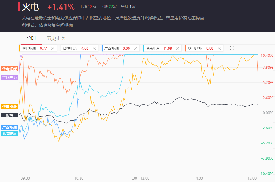 截至收盘,火电、水电分别收涨1.41%、0.31%。