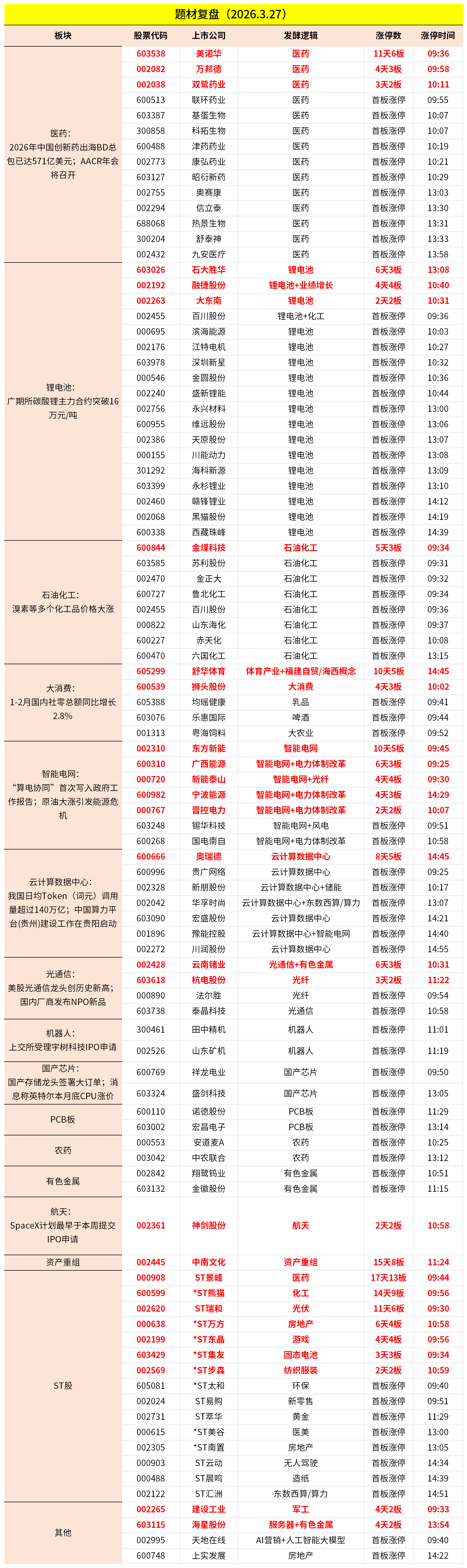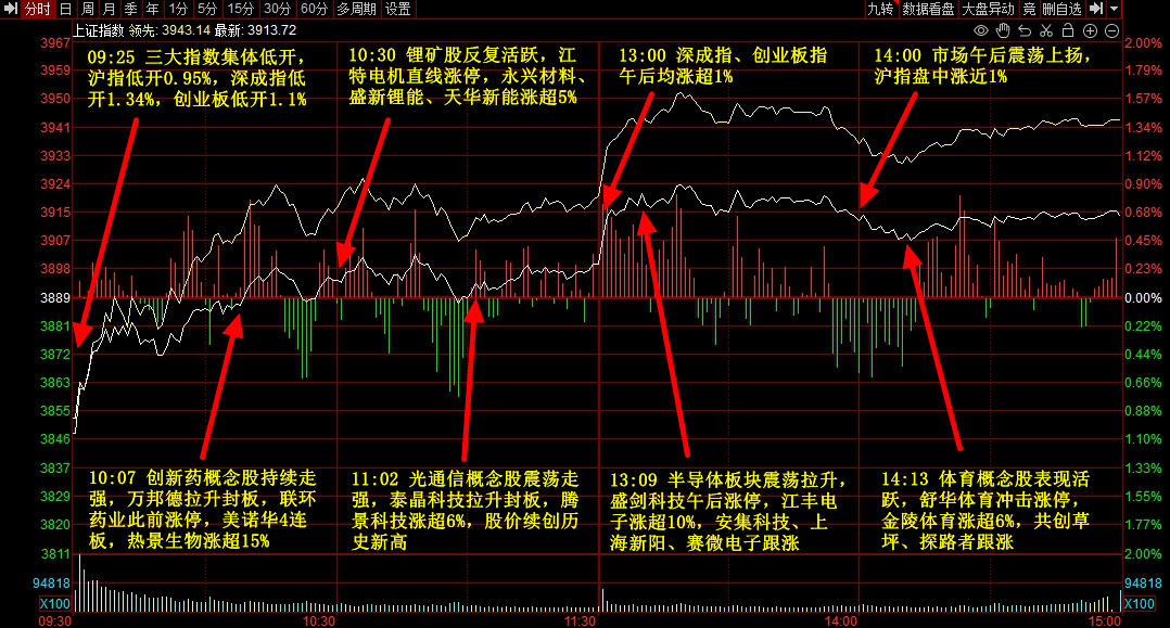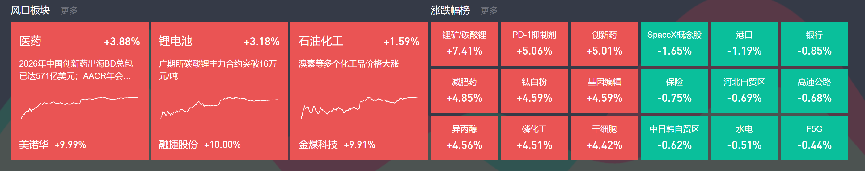 市场全天低开高走,三大指数集体上扬。医药股大幅走强,美诺华4连板,联环药业、昭衍新药、双鹭药业等十余股涨停。锂电板块集体爆发,融捷股份4连板,江特电机、盛新锂能、永兴材料等多股涨停。化工股反复活跃,金煤科技5天3板,鲁北化工、山东海化、赤天化等涨停。下跌方面,煤炭板块调整,辽宁能源跌停。个股涨多跌少,沪深京三市超4300股飘红,今日成交1.86万亿。