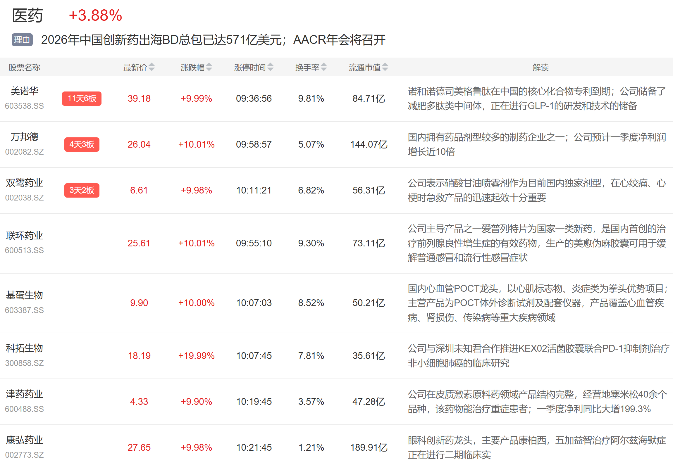 医药板块今日全线大涨,美诺华4连板,万邦德2连板,舒泰神、热景生物等多股涨停。