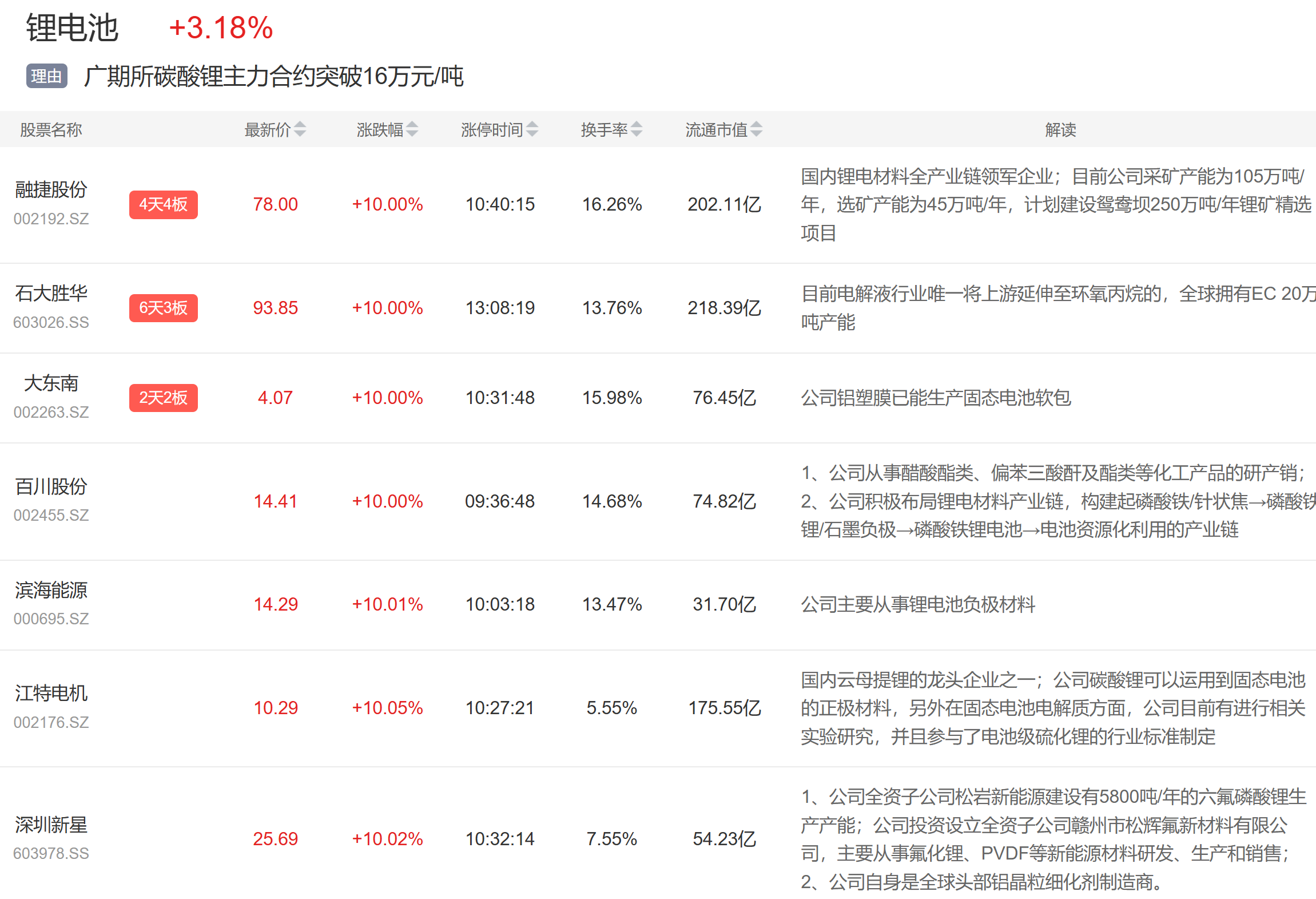 锂电池板块今日延续大涨,融捷股份4连板,石大胜华2连板,海科新源、赣锋锂业等涨停。