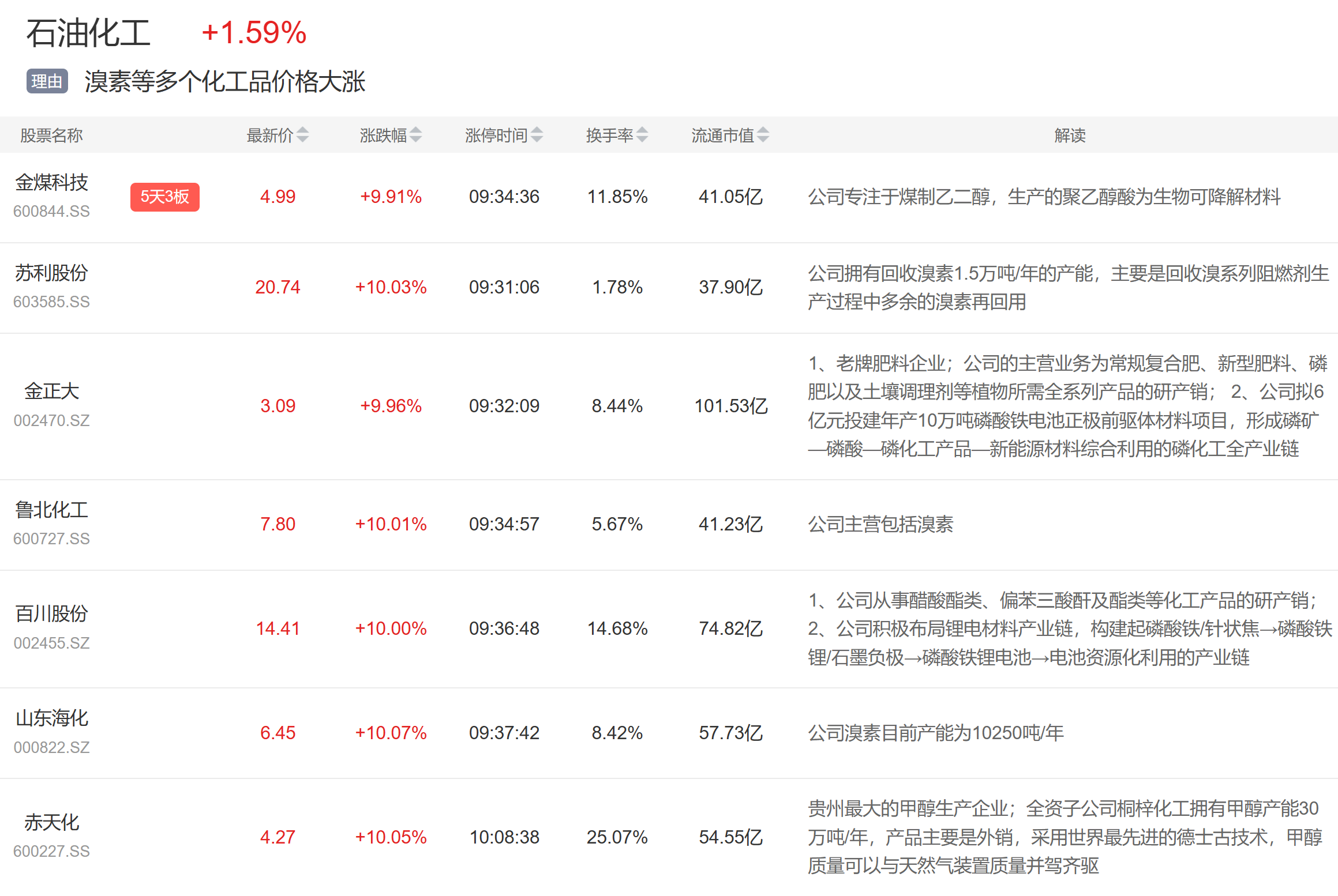 石油化工板块今日上涨,溴素概念表现突出,山东海化、鲁北化工、苏利股份等多股涨停。