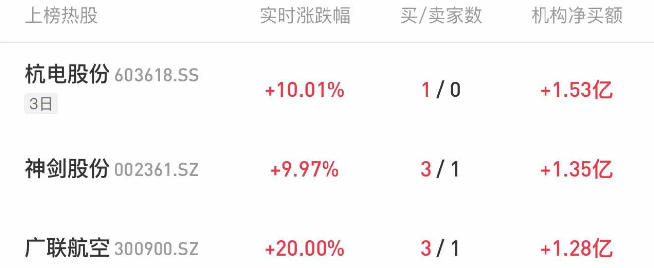 今天机构龙虎榜上榜33只个股,净买入14只,净卖出19只。当日机构买入最多的个股前三位是:杭电股份(3日1.53亿)、神剑股份(1.35亿)、广联航空(1.28亿)。