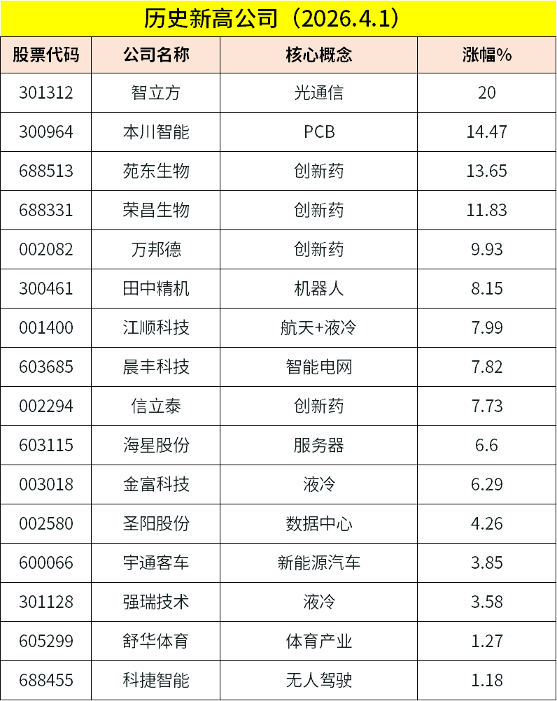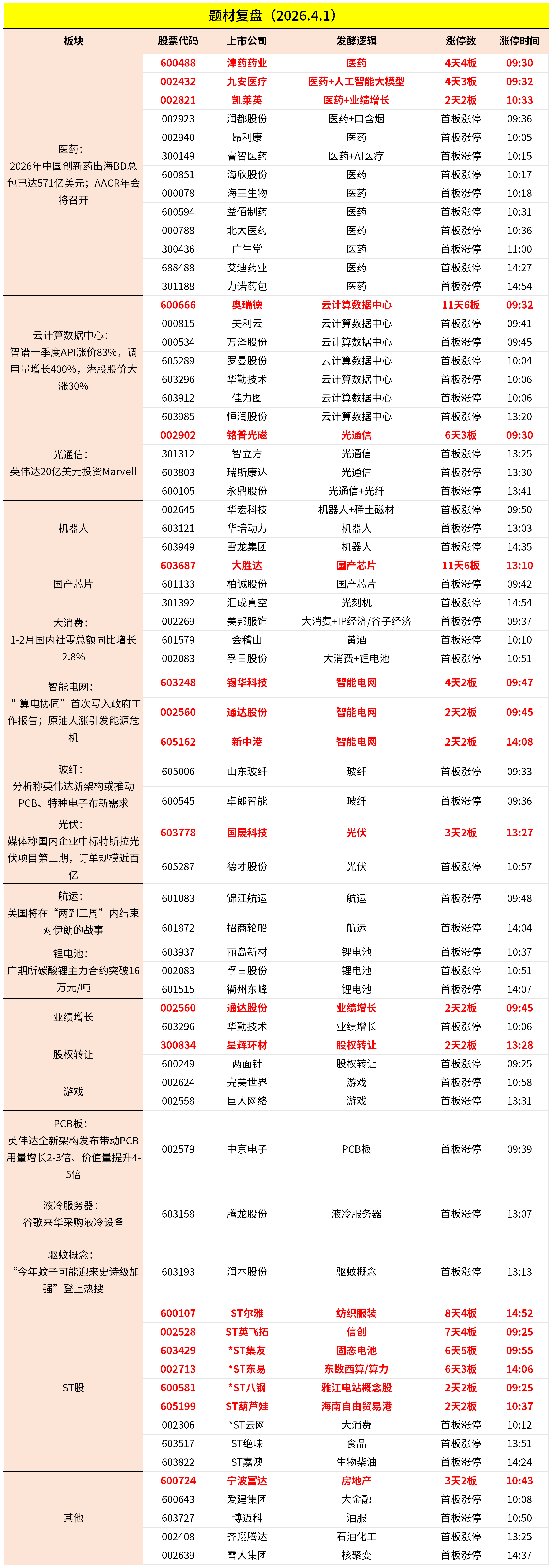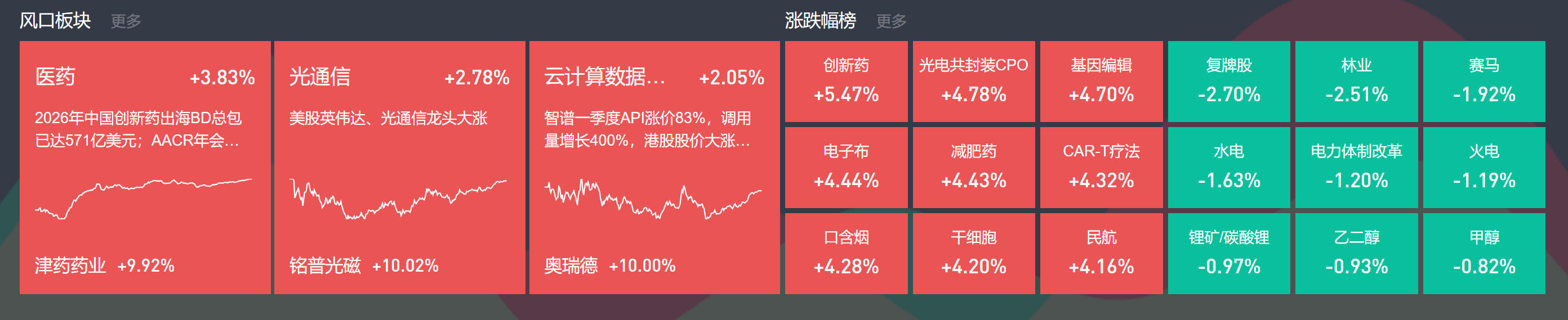市场全天高开震荡,三大指数均涨超1.4%。医药股集体爆发,津药药业4连板,凯莱英、润都股份、昂利康等多股涨停。算力硬件股拉升,智立方20cm涨停创新高,铭普光磁、中京电子、瑞斯康达等多股封板。航运板块走强,锦江航运、招商轮船涨停。下跌方面,绿电概念股调整,惠天热电、中闽能源、华电辽能等跌停。个股涨多跌少,沪深京三市约4500股飘红,今日成交2.02万亿。
