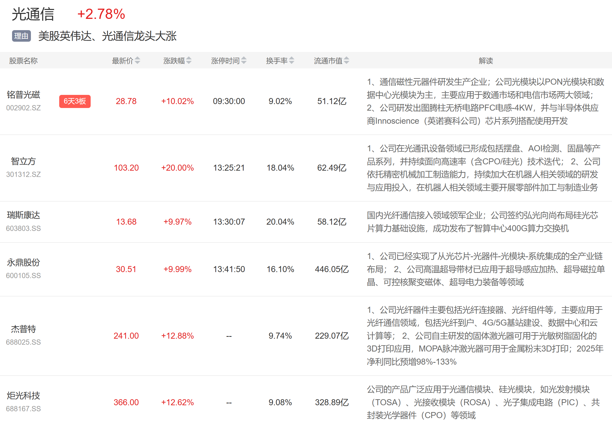光通信板块今日大幅反弹,铭普光磁、智立方、瑞斯康达等多股涨停。
