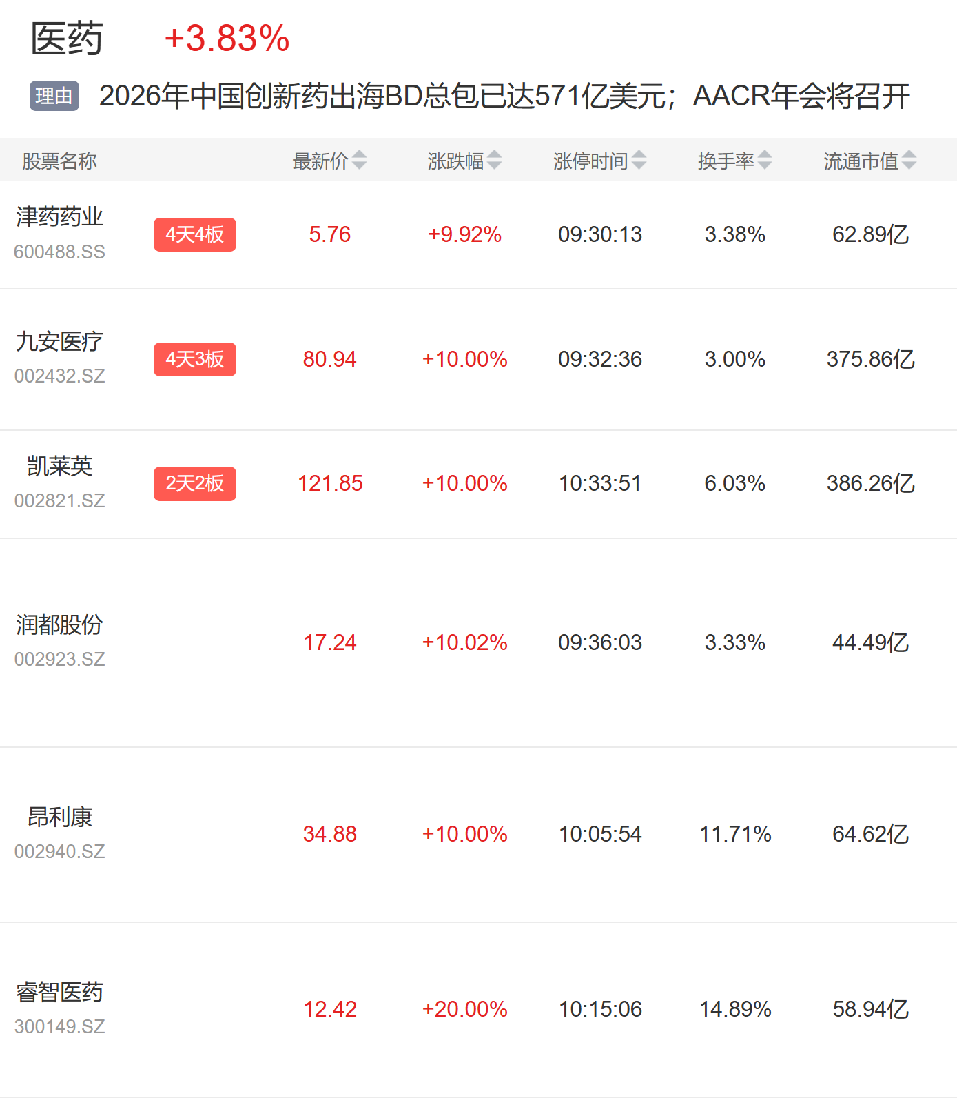 医药板块继续强势,津药药业4连板,凯莱英2连板,九安医疗、润都股份等涨停。