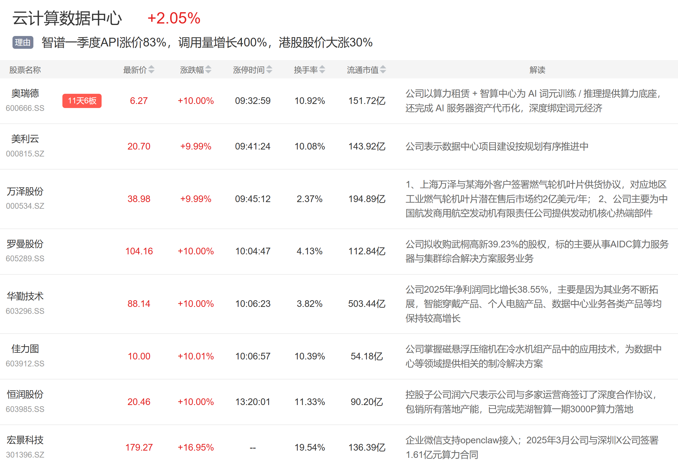 云计算数据中心概念今日大涨,奥瑞德反包涨停,美丽云、佳力图等多股涨停。