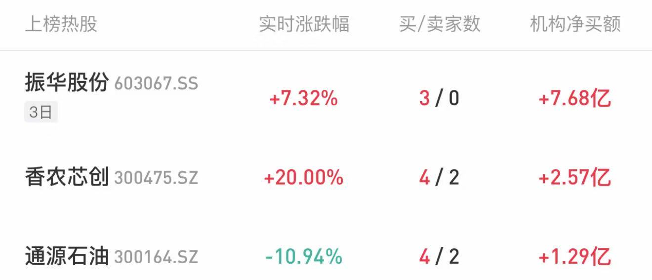 今天机构龙虎榜上榜29只个股,净买入13只,净卖出16只。当日机构买入最多的个股前三位是:振华股份(3日7.68亿)、香农芯创(2.57亿)、通源石油(1.29亿)。