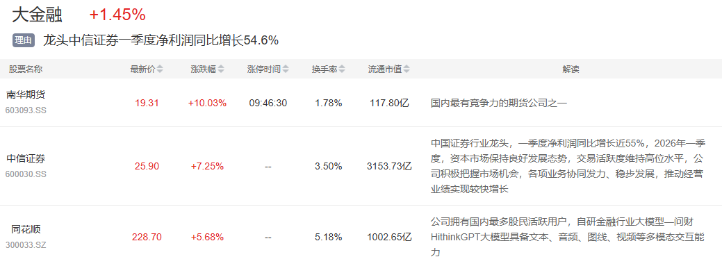 大金融板块今日异动,南华期货涨停,中信证券大涨逾7%,哈投股份一度摸板,人气股银之杰盘中涨超10%。