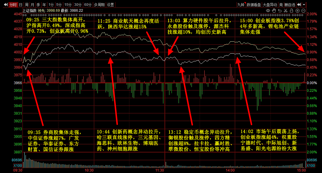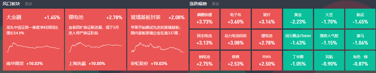 今日沪指全天冲高回落,创业板指午后涨超4%,创2021年12月底以来新高。锂电池产业链集体走强,国轩高科、西藏矿业、上海洗霸等多股涨停;大金融股拉升,南华期货涨停,中信证券涨超7%。玻璃基板封装概念继续活跃,彩虹股份、五方光电、沃格光电均2连板。个股涨多跌少,沪深京三市约4000股飘红,全日成交2.34万亿元。下跌方面,贵金属板块下挫,招金黄金跌超8%。