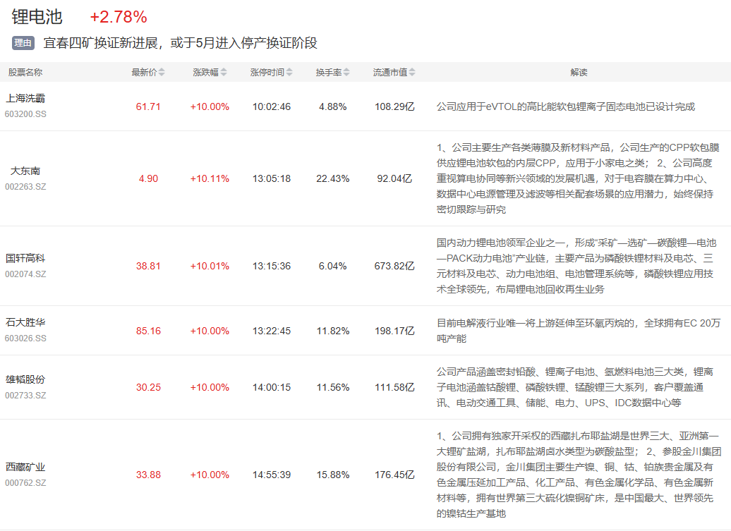 锂电板块今日迎来反弹,前期人气股大东南涨停,石大胜华、西藏矿业等多股涨停。
