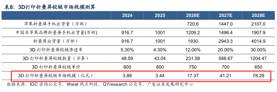 预计26-27年折叠屏出货量将达1200/1500万部,在3D打印折叠屏铰链渗透率为12%/20%情况下,26-27年3D打印铰链规模将达17/41亿元。
