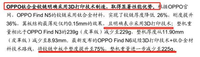 折叠屏铰链:核心增量环节。3D打印钛合金在性能端显著适配折叠屏铰链,目前OPPO和荣耀分别在铰链和端盖采用3D打印钛合金制造;26年苹果入局有望推动折叠屏铰链成为3D打印的核心增量环节。