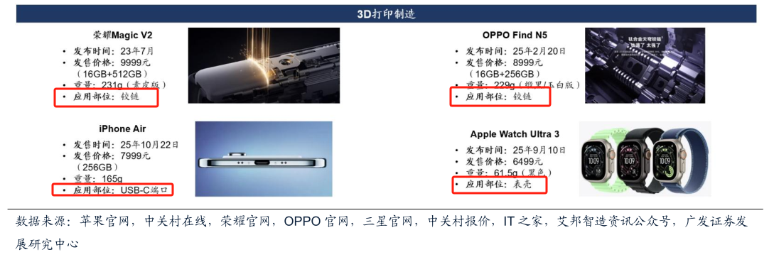广发证券指出,3D打印已经在消费电子中大范围应用,除了手表表壳和手机中框以外,3D打印天然适配折叠屏铰链。后续随着26年苹果入局折叠屏手机,有望显著推动3D打印市场规模扩容。