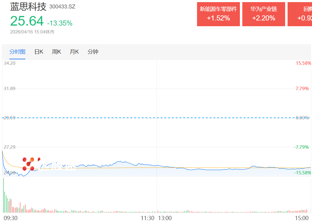 蓝思科技今日竞价低开近9%,开盘后直接下跌,此后震荡全天最终收跌13.35%。
