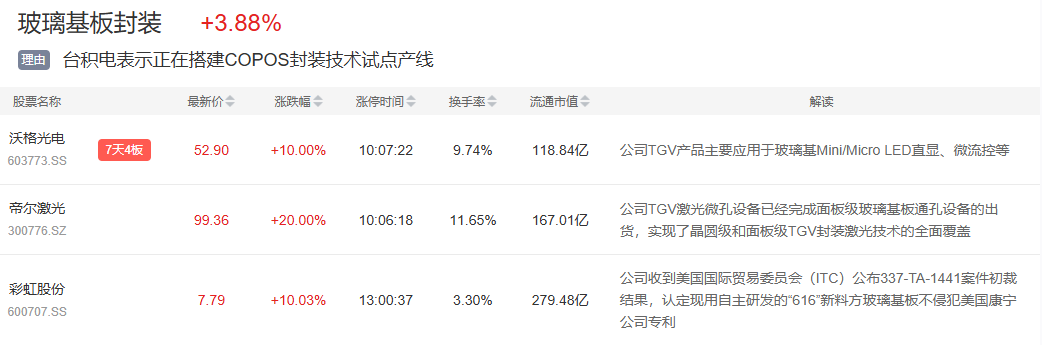 玻璃基板封装板块再度走强,前龙头沃格光电、彩虹股份双双涨停,弹性标的帝尔激光20cm封板。