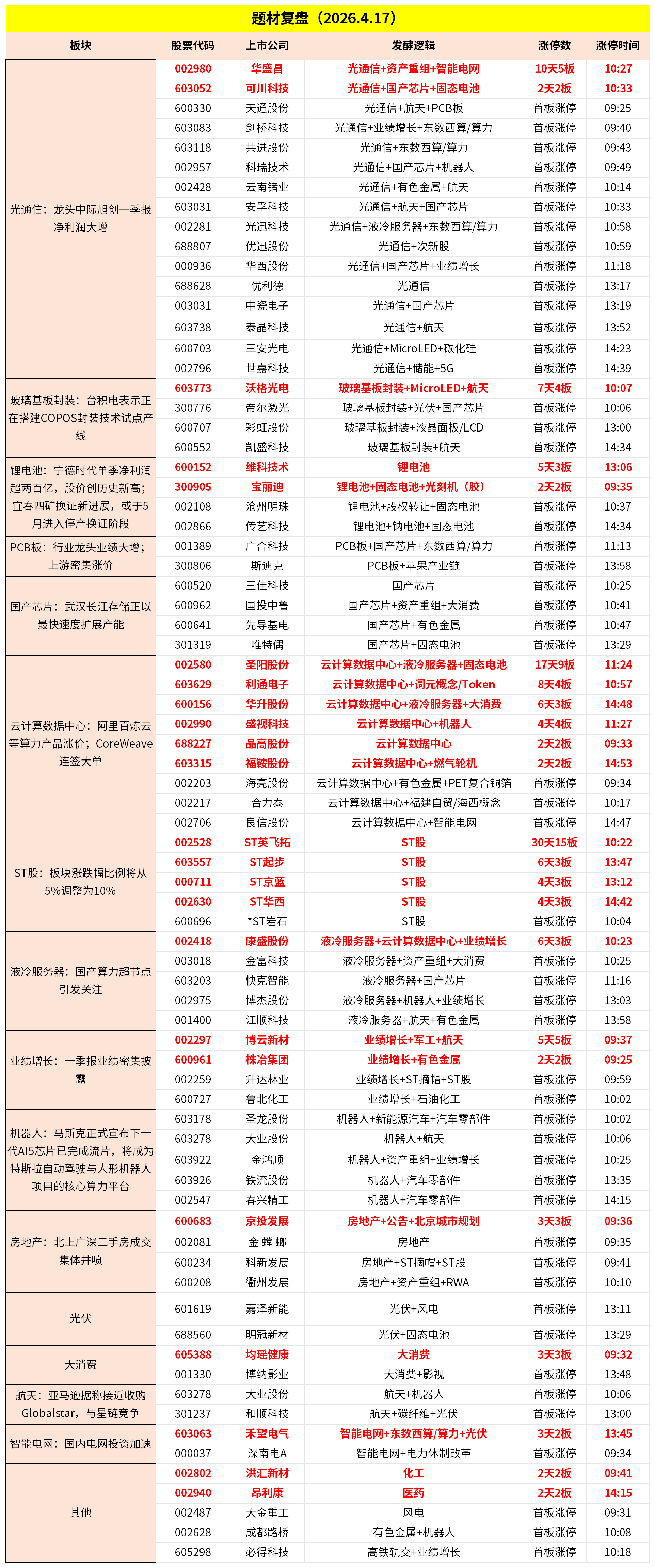 除上述主线热点外,算力、液冷服务器、燃气轮机、商业航天、影视、CPU等板块当日也出现不同程度异动,市场情绪整体偏向科技成长方向。下跌方面,旅游板块调整较为明显,桂林旅游、丽江股份跌幅均超5%,消费类板块承压。